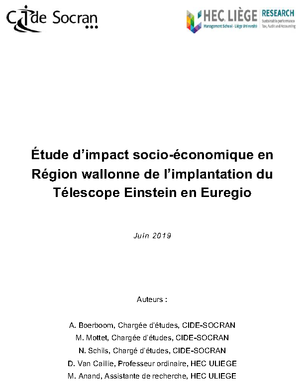 Deze studie uit 2019 beschrijft de potentiële impact van de Einsteintelescoop op het Waalse socio-economische landschap. Ook deze studie vertrekt van het standpunt dat de ET in de EMR regio gebouwd zal worden.